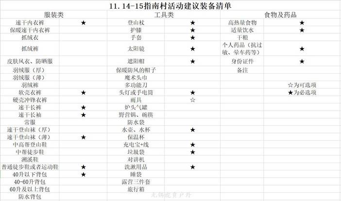 领队:老枪13376204044,甲壳虫13961806353。11月14日6:30火车站全季酒店背后浣月亭集合出发,7:00滨湖区梁清路600号华润万家(滨湖店)肯德基门口(梁清路隐秀路口)集合出发。每个上车点等候5分钟,迟到视为自动退出,费用不退。全程对号入座,定点上下车,中途不停车。请穿着适合户外活动的服装、按表格准备合适的装备。有晕车晕船历史的,请自备药品。请勿穿高跟鞋或者其他不适合户外活动的鞋子参加活动。请按装备推荐认真准备。