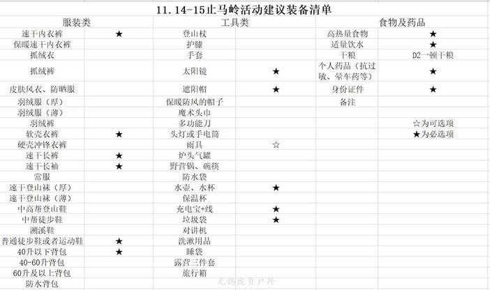 领队:石榴18012475250,豆爷13812068057。11月14日6:30火车站全季酒店背后浣月亭集合出发,7:00滨湖区梁清路600号华润万家(滨湖店)肯德基门口(梁清路隐秀路口)集合出发。每个上车点等候5分钟,迟到视为自动退出,费用不退。全程对号入座,定点上下车,中途不停车。请穿着适合户外活动的服装、按表格准备合适的装备。有晕车晕船历史的,请自备药品。请勿穿高跟鞋或者其他不适合户外活动的鞋子参加活动。请按装备推荐认真准备。