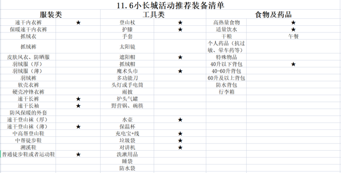 【装备要求】请穿着适合户外运动的服装、运动鞋或者徒步鞋参加。请自带适量饮水。