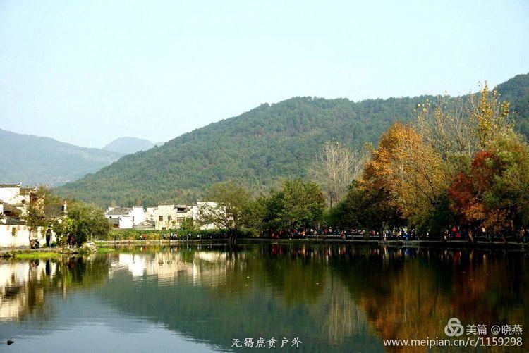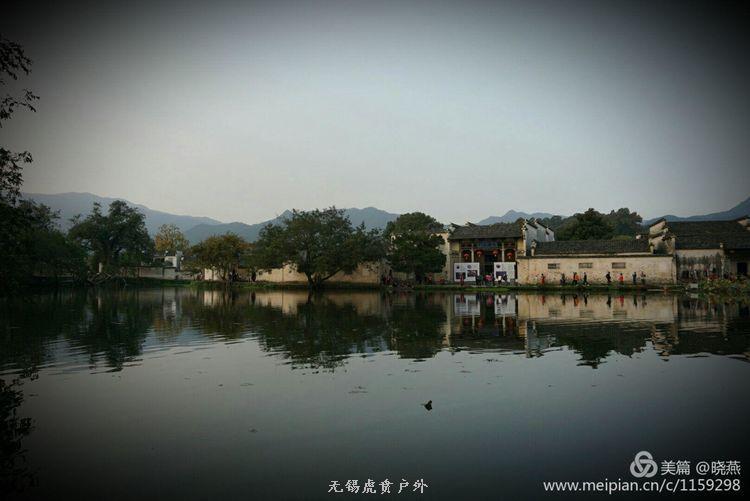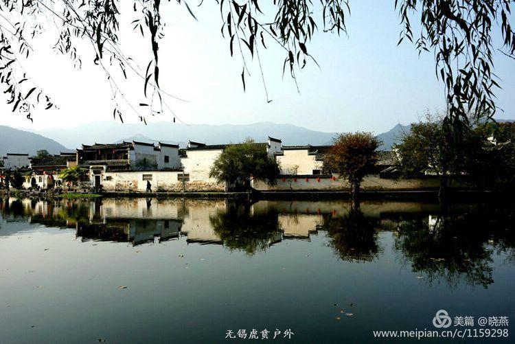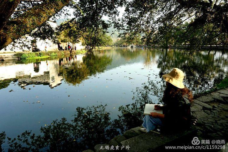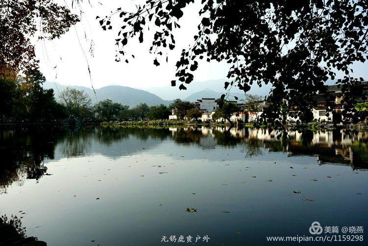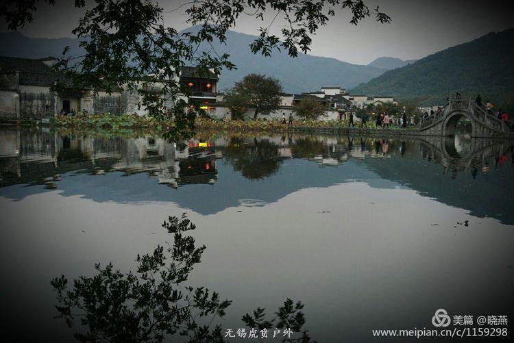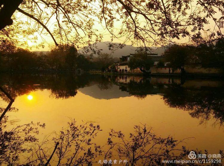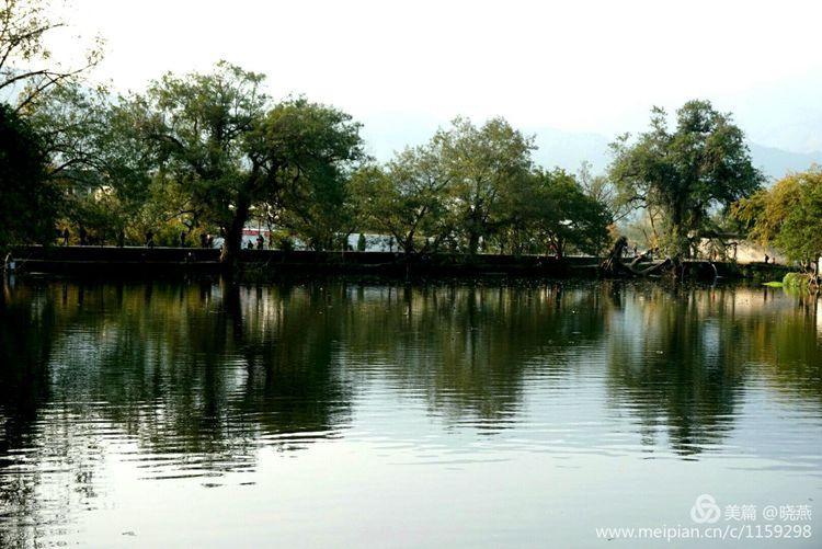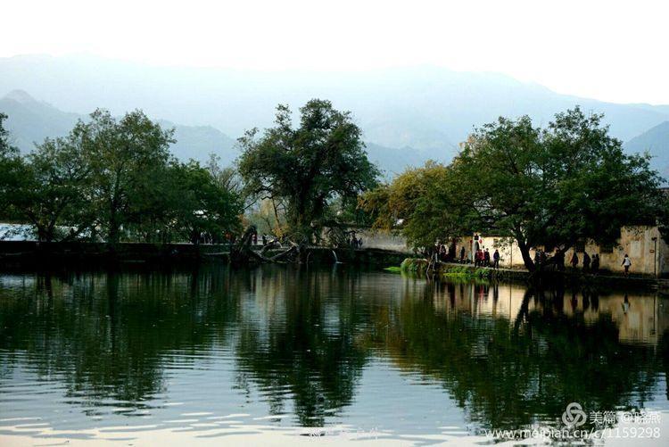 宏村最美是南湖。南湖位于宏村南首,建于明万历丁未年(1607年)。古树参天,苍翠欲滴,躯干青藤盘绕,禽鸟鸣唱,还有垂柳,枝叶婀娜,像临镜梳妆的少女,把秀发洒向湖面水中。湖面绿荷摇曳,鸭群戏水,另有一番景致。整个湖面倒影浮光,水天一色,远峰近宅,跌落湖中,加之树荫水深和日光的相互作用,明暗协调,动静相宜,显得幽深、雅静、清新、明丽。