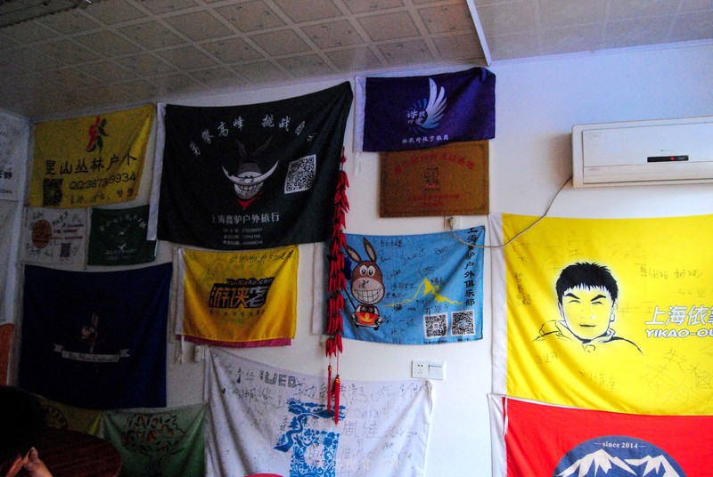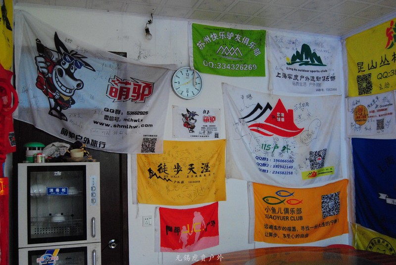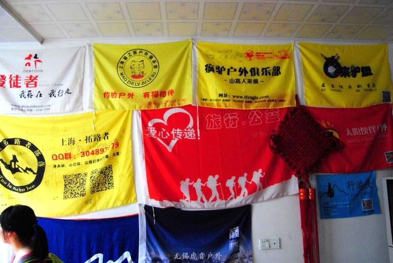 这是在吃饭的地方,有个房间墙壁上挂满了旗帜,都是某某户外团旗子。