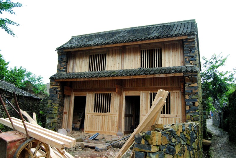 这边这家估计是还没造完的房子,可以看到,外层是砖石结构,里层是木结构。