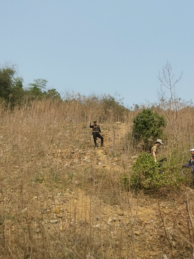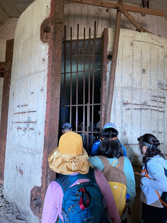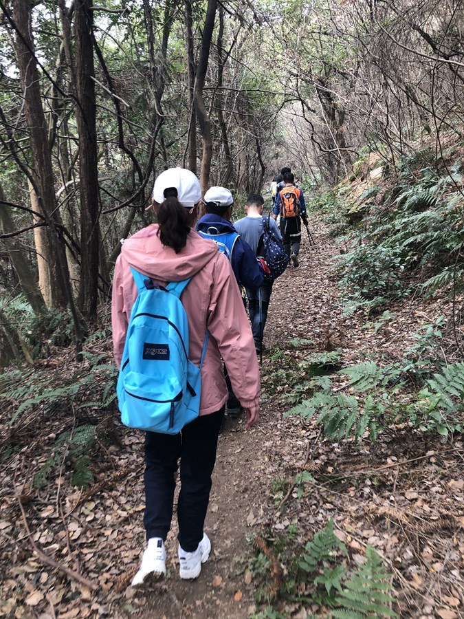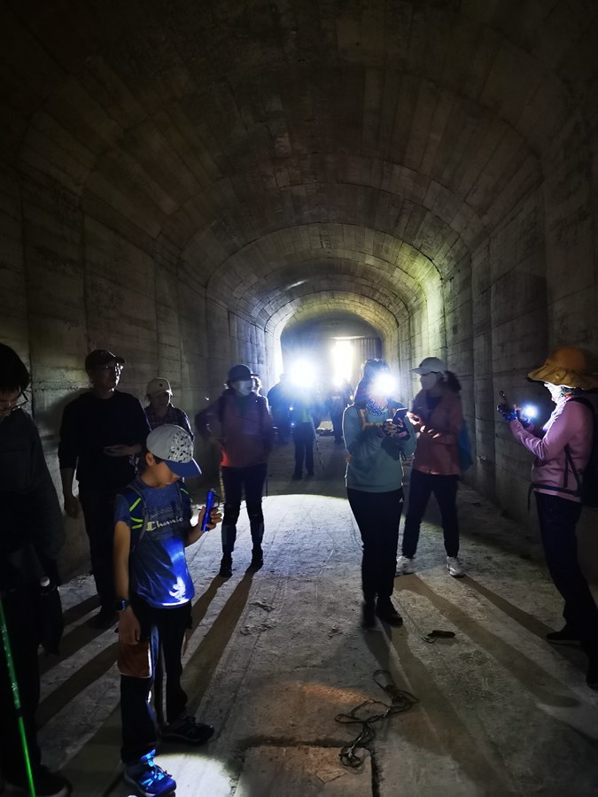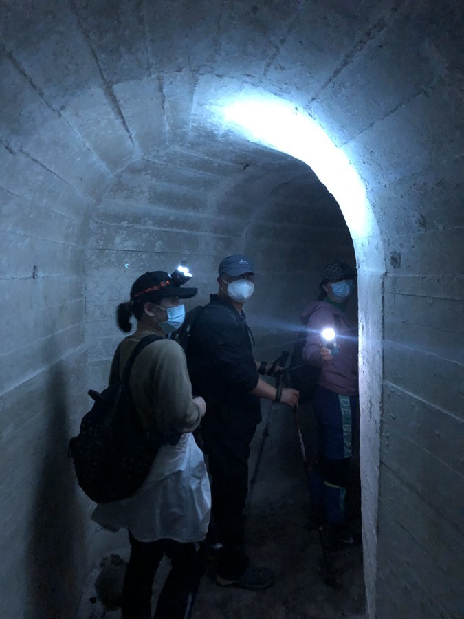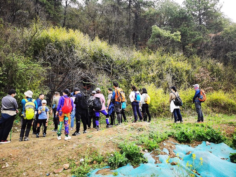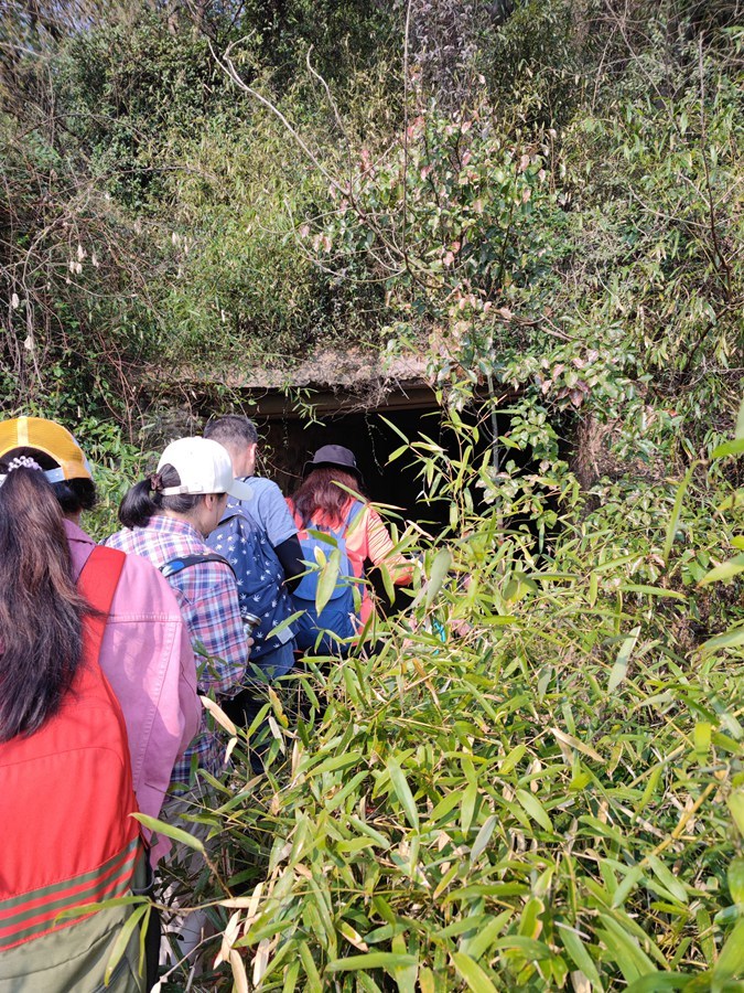 一开始是一段平路,经过了两个农庄,然后再走一段土路,就进入了第一个山洞,其实这都是防空洞,有段时间是租给了农户种植菌菇的,现在的状态应该是闲置。穿过第一个山洞后有一段上坡路,然后就是相对平整的防火道,一直走就能接上阖舜密道。抵达九龙湾山顶的时候,已经是阳光灿烂了,因为下雨而放弃的小伙伴,拍断腿啊!第二段防空洞比较小,尤其是出口更小,建议大胖子不要来是明智的。石榴姐很细心的带了一块布垫在洞口,这样大家就不会弄脏衣服了,点个赞,很有心!
