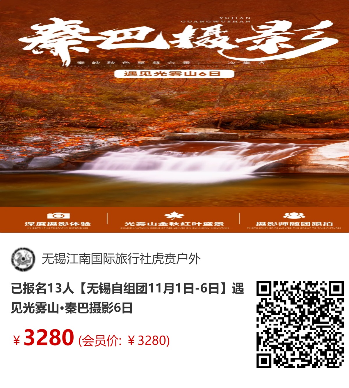 一大早吃完早餐后从光雾山镇出发,直奔海拔2330米的【香炉山】(行程距离:20km 行车时间:30分钟),在破晓时分登顶观景台,看旭日将云海染成金红色,脚下万亩彩林在晨雾中若隐若现。随后前往【天然画廊】(行程距离:15km 行车时间:30分钟),漫步3公里原始森林栈道,笔直的水青冈与火红的三角枫构成天然油画,阳光透过树冠在苔藓上投下光斑。午后深入【黑熊沟】(行程距离:8km 行车时间:20分钟),踩着半米厚的红叶"地毯"探秘峡谷,瀑布从锈红色岩壁跌落,偶遇松鼠在枝头跳跃。随后抵达【大小兰沟】(相邻景区),在2.5公里溪谷中捕捉红叶与碧潭的108种配色,无人机视角下蜿蜒的河道如同大地血脉。游玩结束后启程返回【汉中】入住(行程距离:160km 行车时间:3小时),暮色中重走米仓山秋色长廊,满载着红叶记忆与相机里的绝美大片。