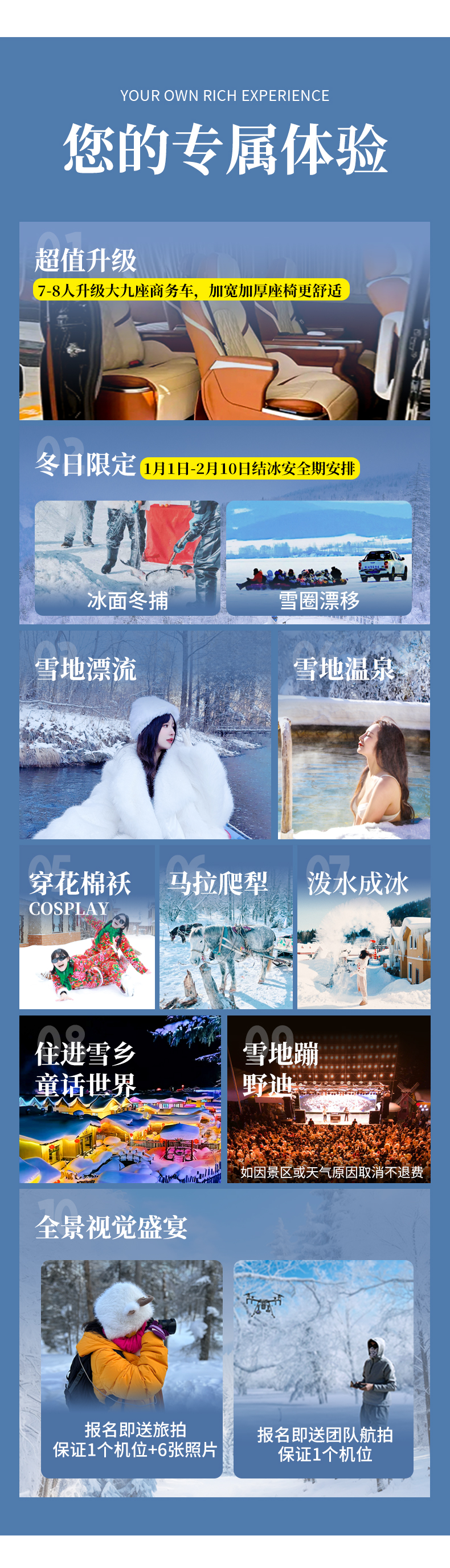 4、赠送冰面雪圈、冰面冬捕(1月1日-2月10日结冰安全期安排,其他时间无法安排不退费用);
