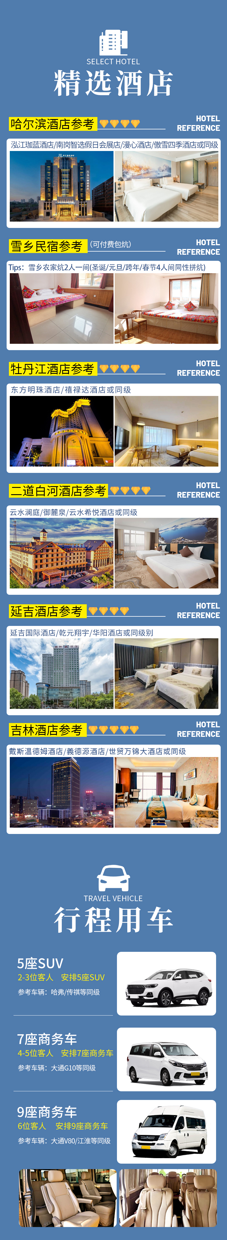 1.2米以下为儿童,含车位费、雪乡炕位、滑雪、赠送项目、保险、免门票、免早餐,不含酒店住宿、不含雪地漂流,不含温泉正常1.2米以下免票如遇收费自理;超高但未满12周岁需补门票440元+温泉100元/次+早餐费190元;如需占床需补床位费5晚酒店1400元/人含早餐含温泉,1晚农家炕如想单住请现询客服。 私家团费用说明: · 2人起天天发团,司机兼管家,如逢单数报名产生空床位需补单房差 · 雪乡2人一间炕(包括圣诞/跨年/元旦/春节团期) · 包含解散日或隔天统一送机 · 2-3客人用5座SUV,4-5客人用7座商务车,6客人用9座商务车,7-8客人用大九座商务车,9-12客人用15-18座旅行巴士,保证百分之二十空座率。(如用15座及以上车型每日行程时间会比小型商务车增加1-3小时不等,望您悉知。) 优惠团期补900元/人(包含雪乡炕位升级),如产生空床位需要补单房差1950元(750+300+900) 升级参考酒店如下: 哈尔滨市:参考施柏阁酒店或皇冠假日或新巴黎酒店或同级5钻酒店 雪乡:参考雪筑遇见/纳山纳雪/雪韵假日/万嘉森林或同级别4钻轻奢民宿 牡丹江市:参考夏威夷/世贸假日或同级5钻酒店 二道白河镇参考:王朝圣地酒店或同级5钻酒店 延吉市参考:卡伊洛斯或红菊大厦或同级5钻酒店 吉林市:与散拼团同为5钻酒店标准,补差价不含这一晚费用 | ||||