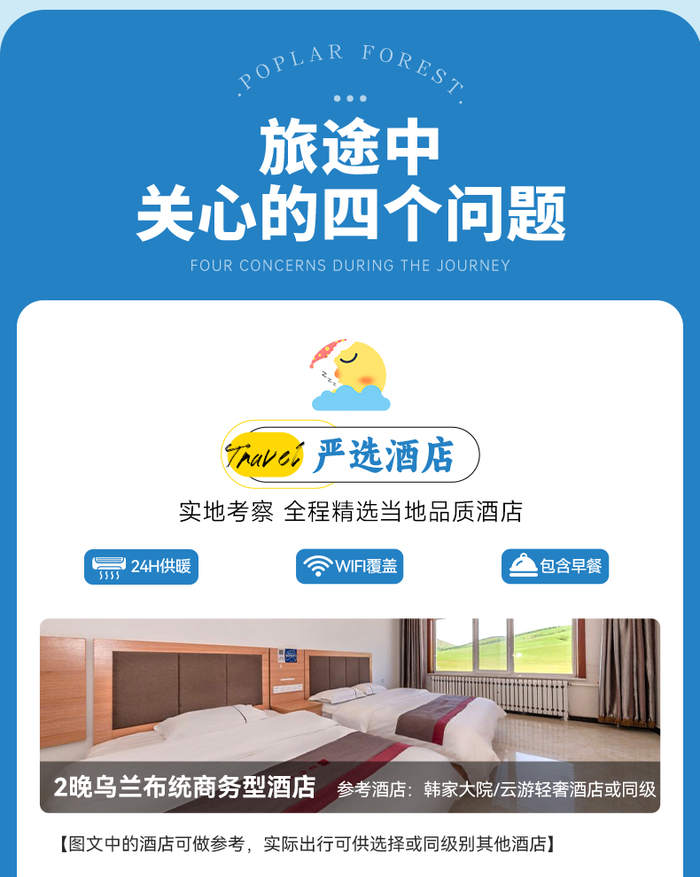 3、住宿:全程2晚乌兰布统当地舒适型酒店标间(连住2晚)