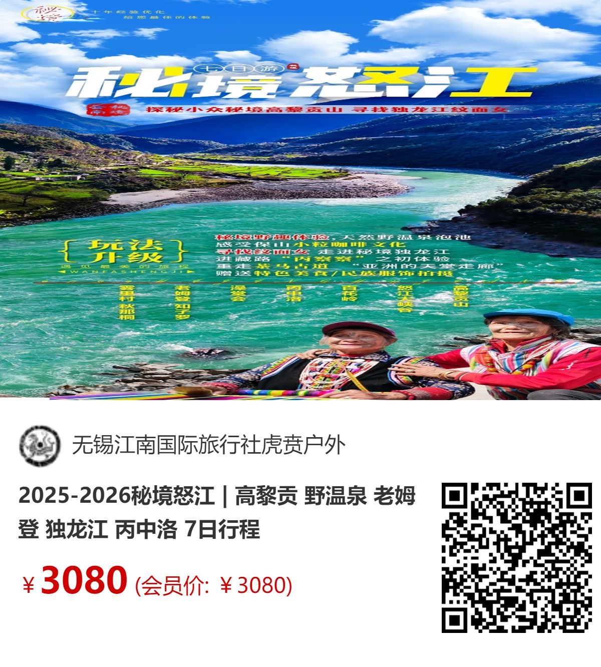 服装:平时着秋装即可,但怒江峡谷昼夜温差大,一定要带厚些的衣物(轻薄羽绒/厚抓绒)及替换衣物;