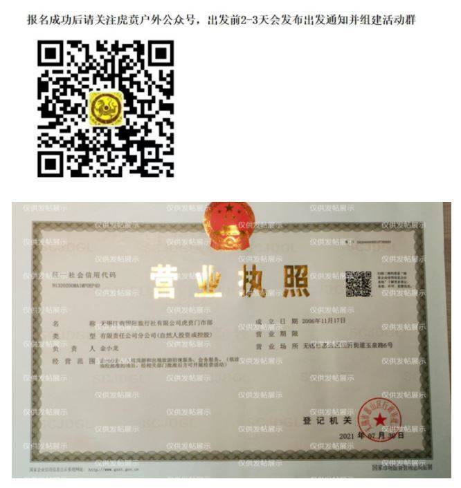 4.户外活动和传统旅游不同,隐含一些无法预料的风险,请参加者正确理解和评估自身的能力,遇到情况及时和工作人员联系解决,不要盲目涉险。虎贲户外在活动开始前会为所有参加者购买合适的出游保险,如发生意外,由保险公司按照条款负责理赔,虎贲户外和现场工作人员以及同行的其他参加者不承担任何责任赔偿要求。