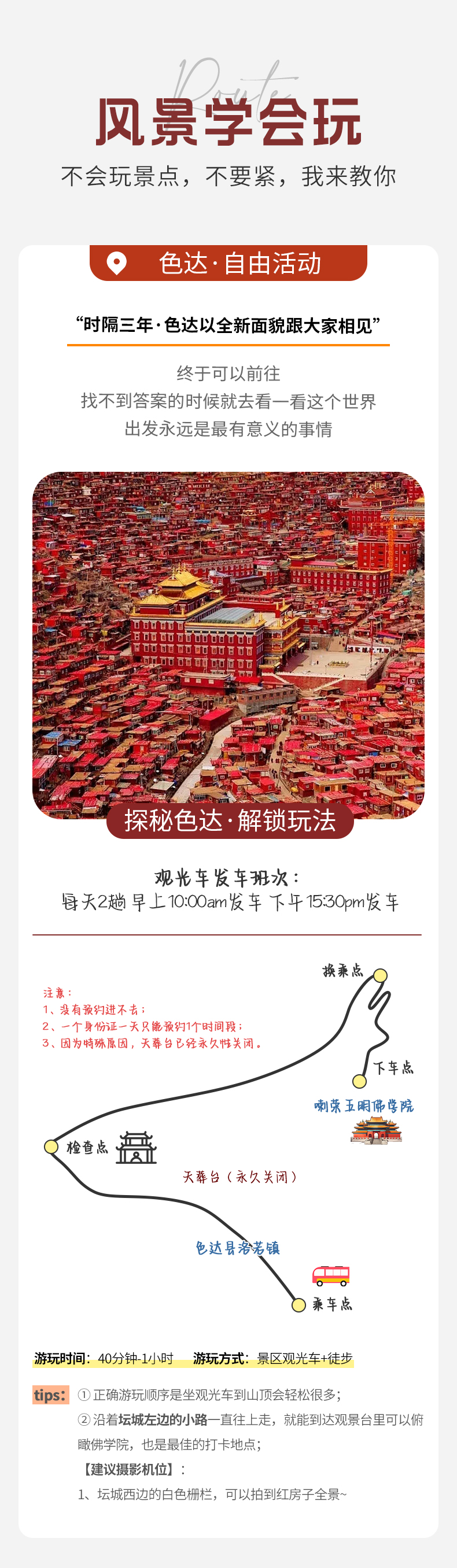 ①色达均是预约进入,统一观光车参观游览。