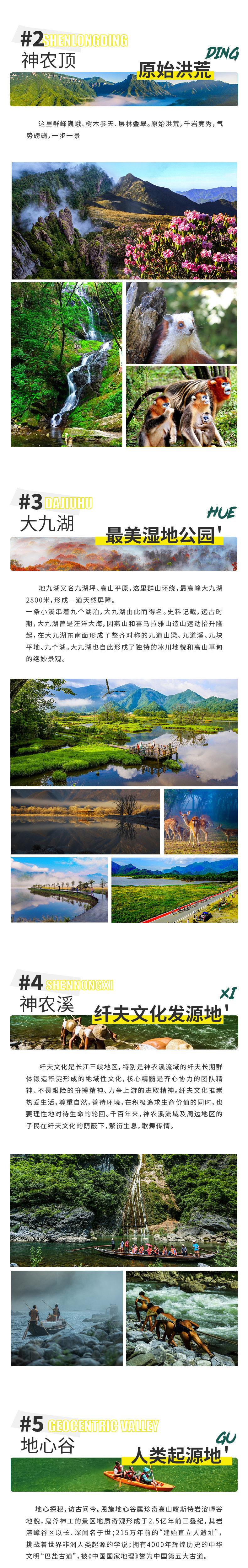 3. 门票:神农架景区门票、屏山峡谷门票+船票+换乘车、恩施大峡谷门票+景交+地面缆车、梭布垭石林门票+景交、神农溪门票、地心谷门票