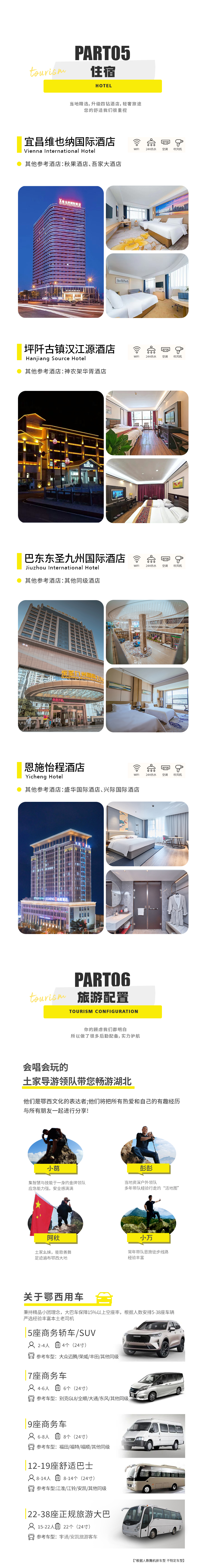 2. 住宿:共6晚(宜昌市区准四标间一晚, 坪阡古镇准四酒店标间一晚,巴东四钻酒店标间一晚,恩施四钻酒店标间三晚)