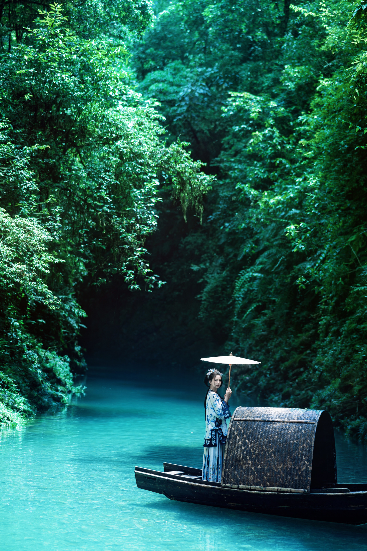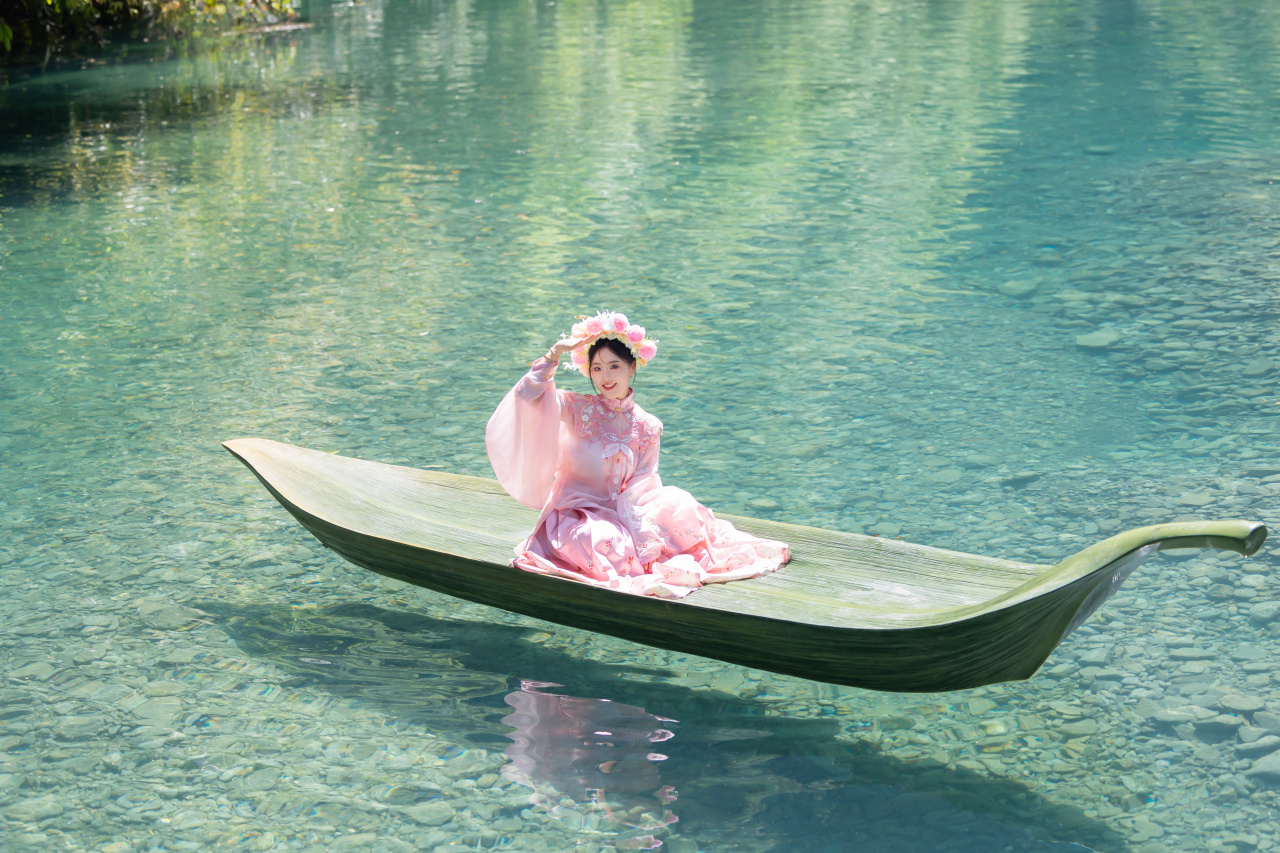 屏山地形奇特,整体呈狭长弧形地势,四周峭壁耸立,碧水穿梭其中,清澈见底,船行河面恰逢一束阳光从峡谷上方洒下,在河面形成暗色投影,船只犹如悬浮在半空中。逢此天工美景,你脑补的我们都想到了,端坐在木船之上倾国倾城不倾船。作为一个真正的戏精,请时刻保持镜头感,来给个V,我保证看不出来是摆拍