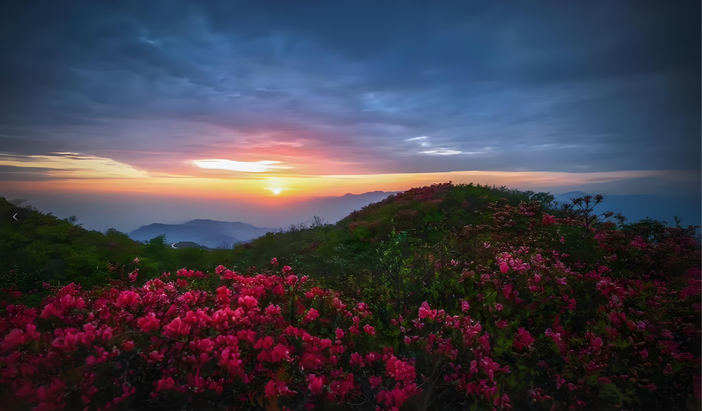 富阳浮云岭位于杭州市富阳区万市镇何务村,地处富阳、临安、桐庐三地交界,是一座以云海、花海和苏轼文化为特色的生态公园。每年4月,映山红(杜鹃)接力绽放,漫山红紫相间,如火焰燃烧,是观赏“满山红”的最佳时机。