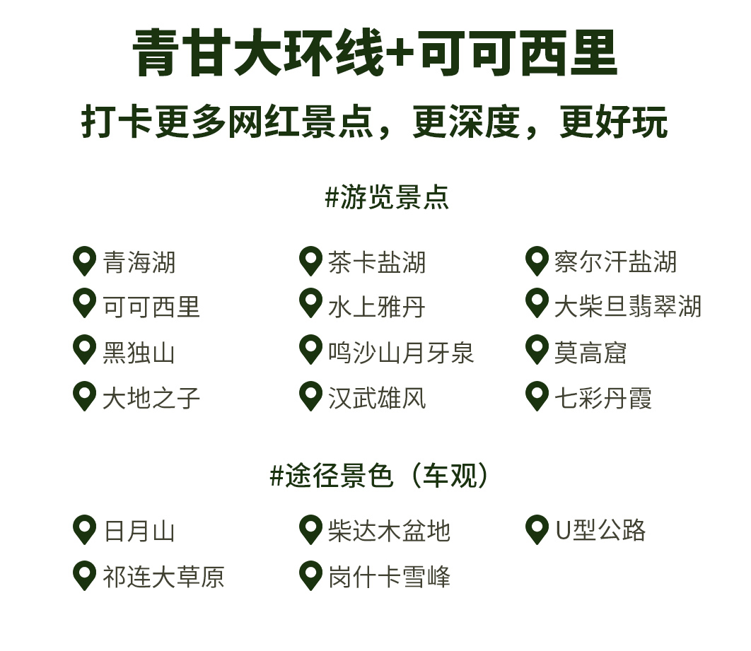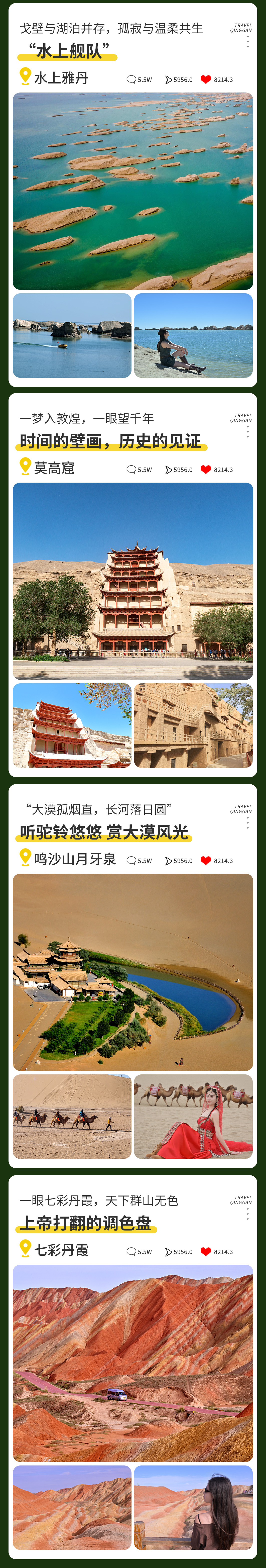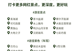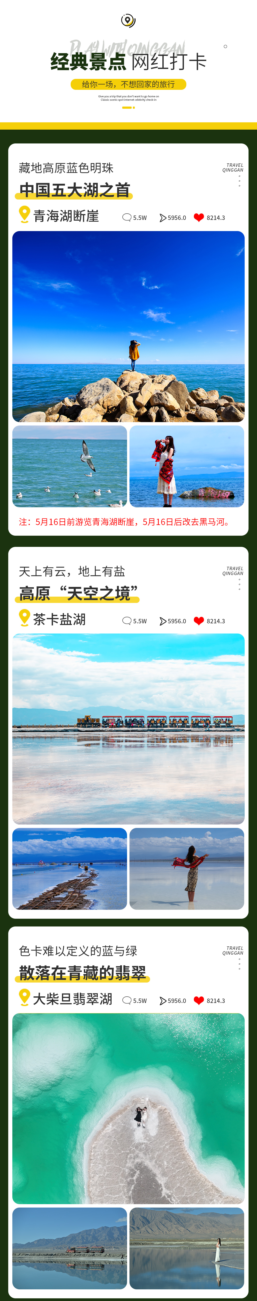 青海湖、茶卡盐湖、可可西里、大柴旦翡翠湖、水上雅丹、莫高窟、鸣沙山、七彩丹霞