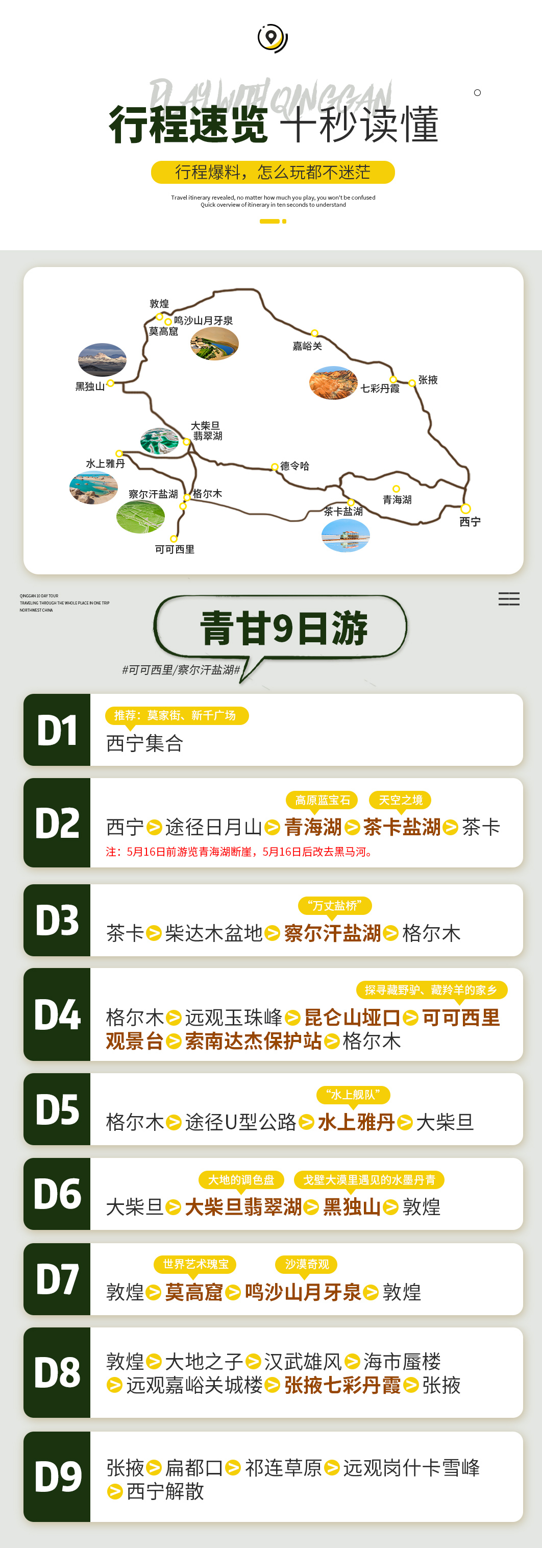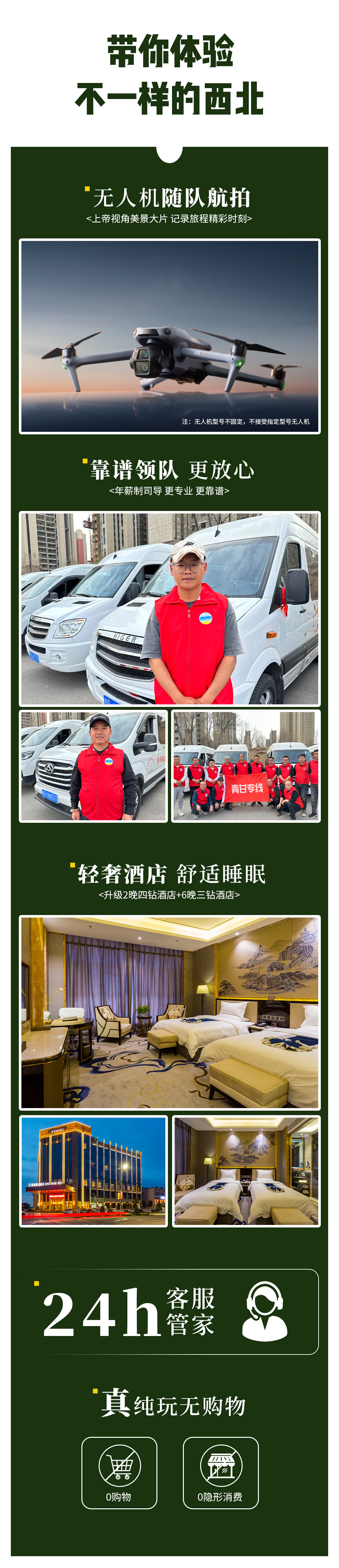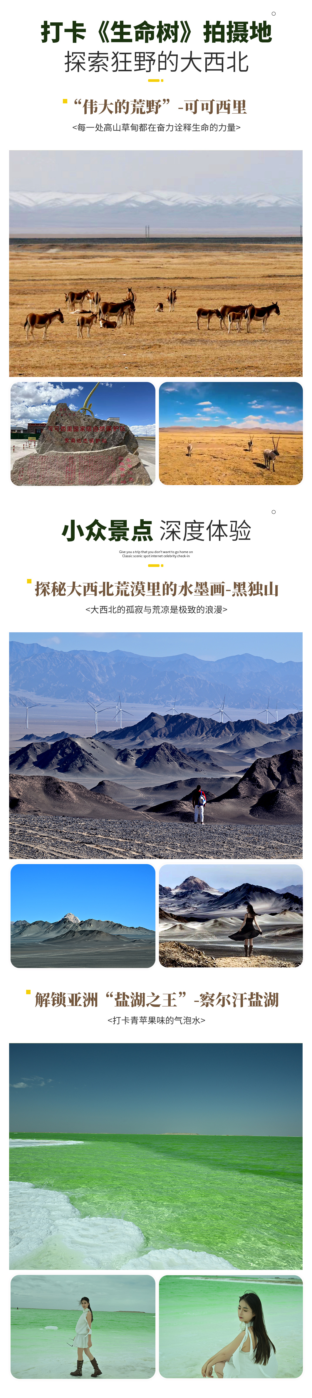 【景点】所列景点首道大门票:茶卡盐湖、察尔汗盐湖、水上雅丹、大柴旦翡翠湖、鸣沙山月牙泉、七彩丹霞。
