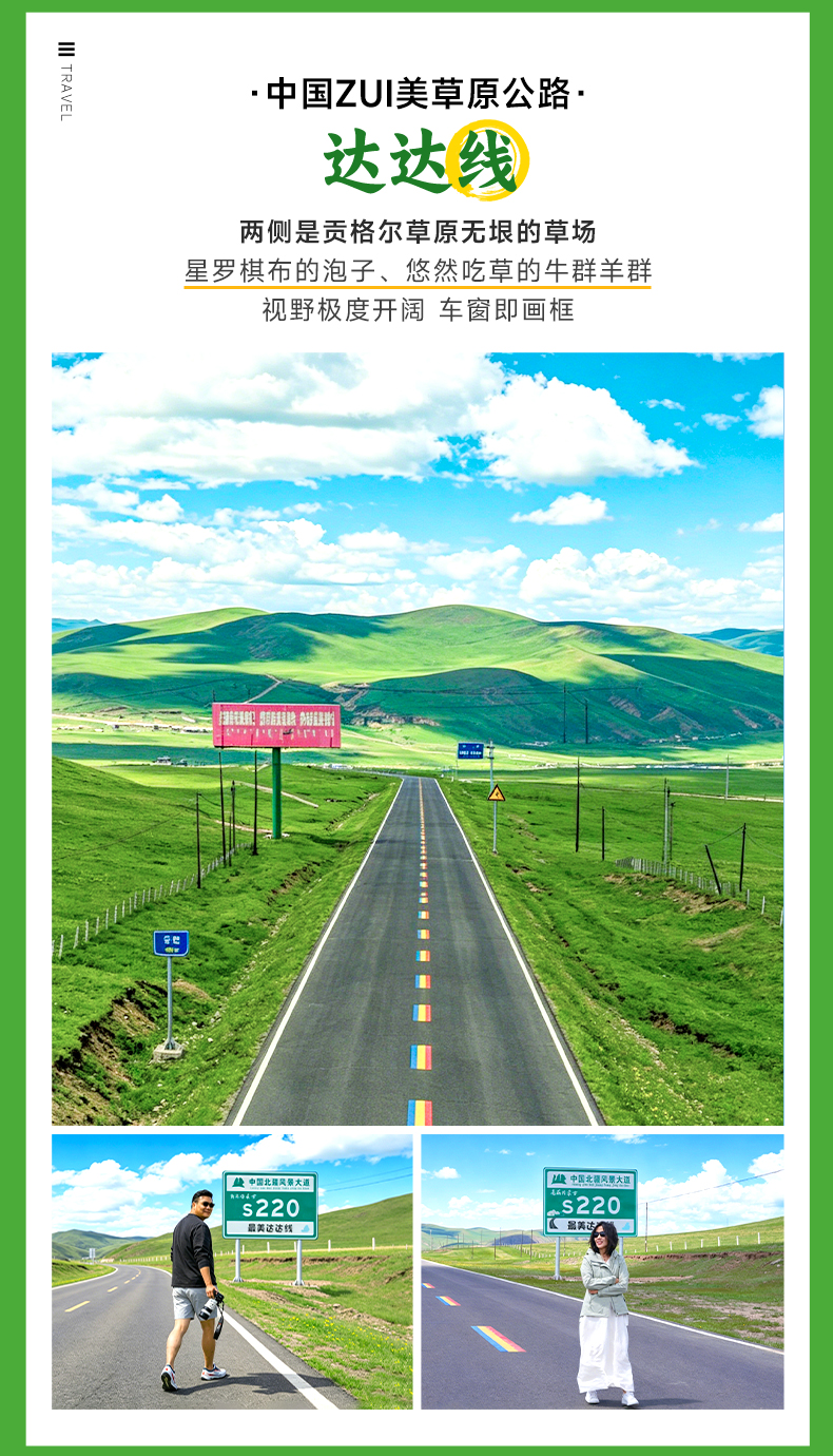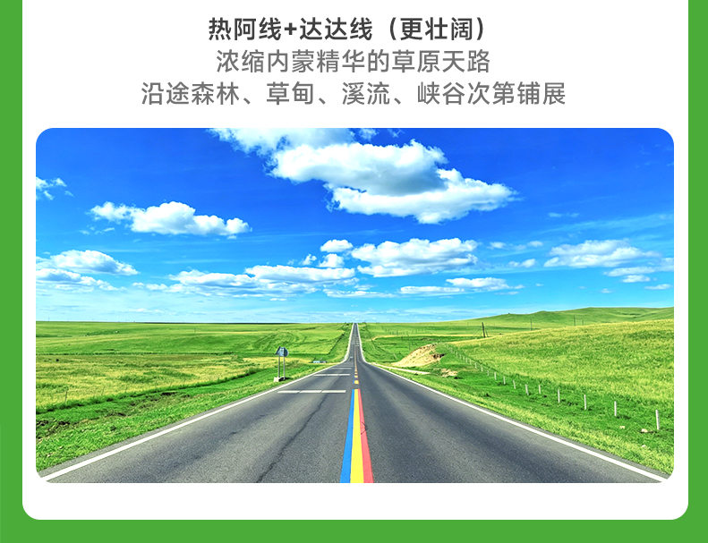 下午,驶入被誉为“中国ZUI美草原公路”之一的【达达线】。公路在广袤无垠的草原上蜿蜒伸展。沿途是望不到边际的绿色草甸,还有悠闲的牛羊点缀其中,洁白的羊群像天上飘落的云朵,悠闲地在草原上溜达;矫健的骏马时而昂首嘶鸣,时而扬蹄飞奔,增添了无限生机。远处,星星点点的蒙古包,升起袅袅炊烟,那是草原人家生活的烟火气息。行驶在这条路上,仿佛走进了一幅流动的画卷,每一处转角,都藏着意想不到的惊喜。