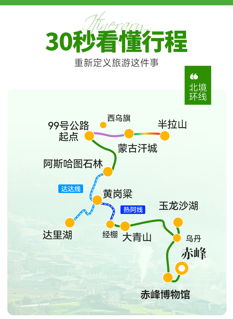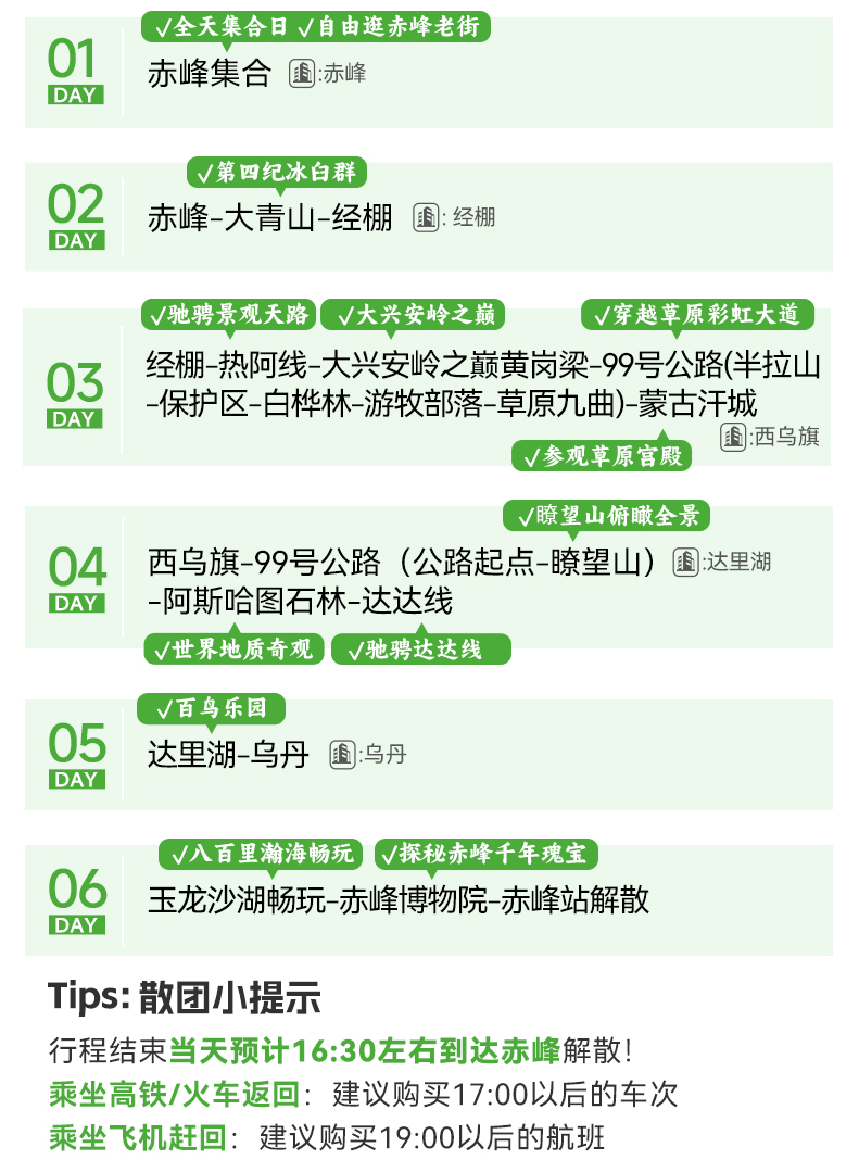 1、行程结束当天预计下午16:30左右到达【赤峰站】解散,大家可以依据自己的时间,自行选择继续游玩或是启程回家。