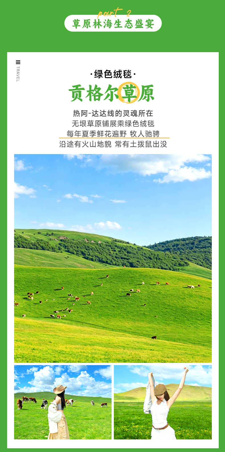 途经保存完好的【贡格尔草原】,广袤草原碧草连天,鲜花遍野。牛群、羊群与马匹,如繁星般点缀在草原上,我们将放慢速度尽情拍照。