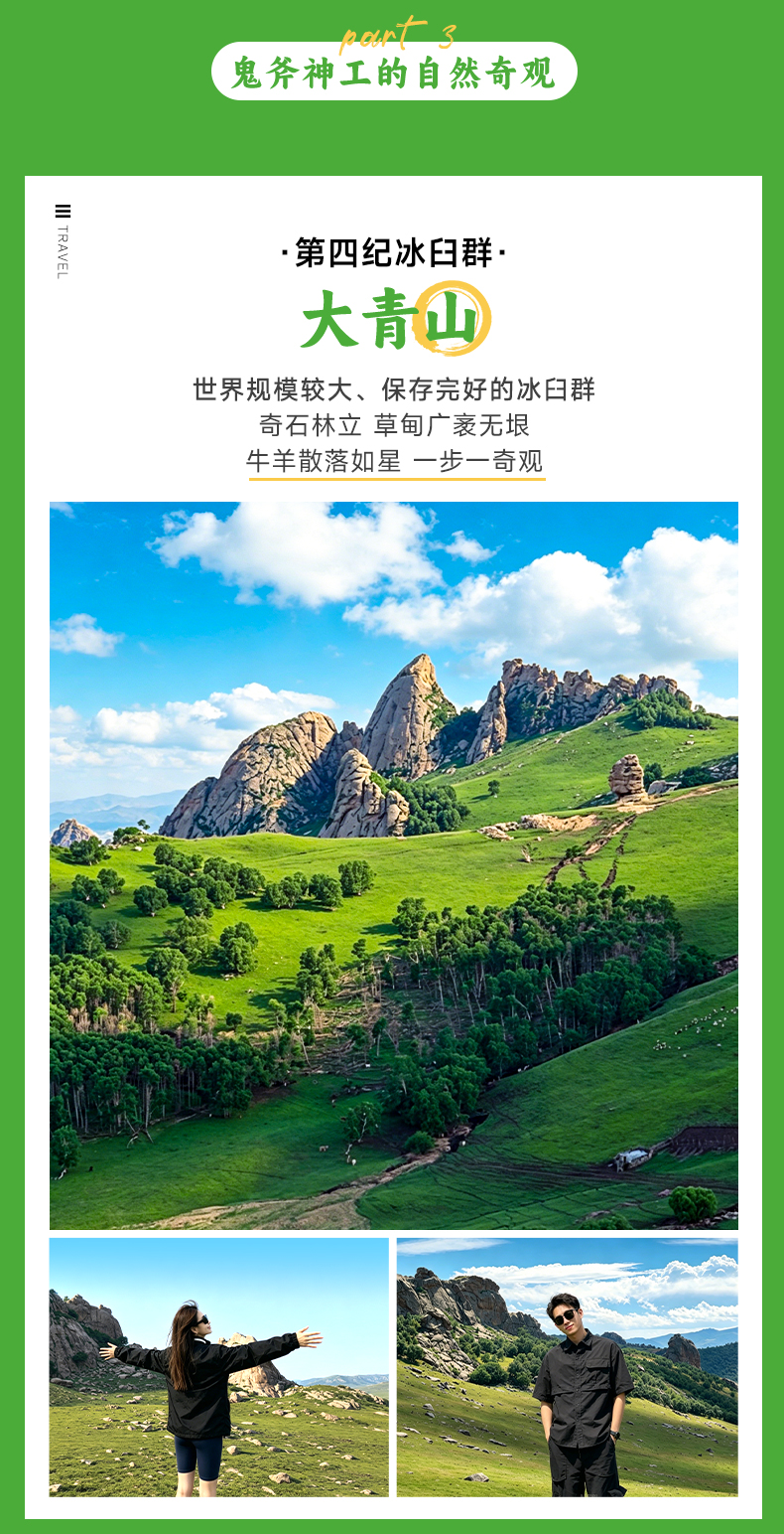 早餐后前往【大青山】(车程约2.5小时),这里地处大兴安岭东南边缘,是蒙古高原与燕山山脉过渡带的地质瑰宝。景区总面积 30 余平方公里,最高峰海拔 1574 米;拥有第四纪冰川遗留的世界级岩臼(冰臼)群、形态万千的花岗岩石林与象形石、广袤的高山草甸及白桦林带,兼具科研价值与极致风光。