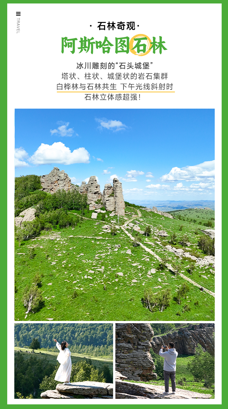 随后前往世界地质奇观——【阿斯哈图石林】(车程约1.5小时)。历经亿万年冰川雕琢的花岗岩石林,形态各异,气势恢宏。有的石柱如巨人般巍峨耸立,直插云霄;有的岩石似骏马奔腾,栩栩如生。在石林中穿梭,触摸着粗糙的岩石表面,仿佛能感受到岁月的沧桑与历史的厚重。俯瞰整个石林,连绵起伏的岩石与远处的草浪相互映衬,构成了一幅震撼人心的壮美画卷,让人不禁感叹大自然的鬼斧神工。