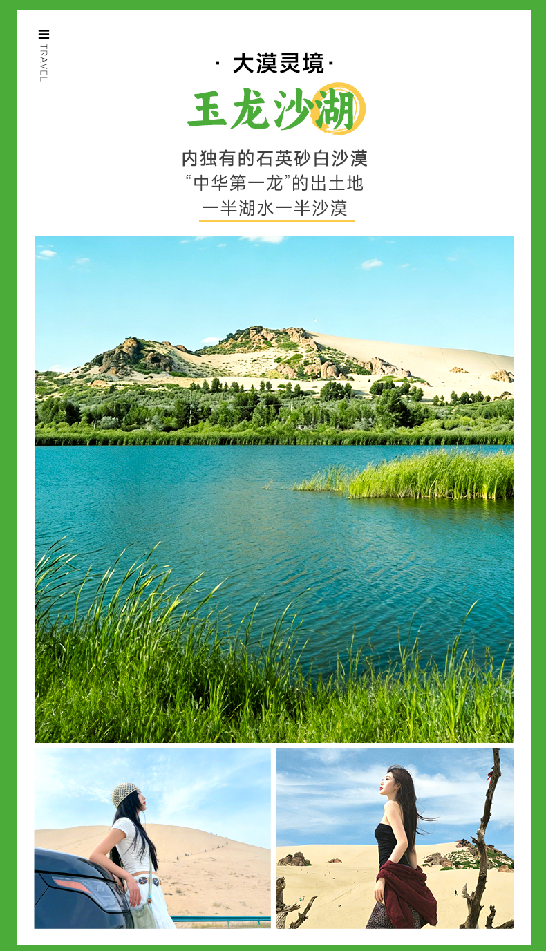 早餐后,驱车前往【玉龙沙湖】(车程约30分钟),沙漠畅玩,踏上冒险之旅!景区以大漠为主调,集响沙、草原、湖泊、湿地、怪石、奇松等山川形胜、蒙古风情于一体。由韩庚、范冰冰主演的电影《万物生长》曾在这里取景,闻名中外的新石器时代红山文化标志物 ——“中华di一龙”也在此出土,将中华五千年的古文明史起源又向前追溯了一千多年,因此得名“玉龙沙湖”。