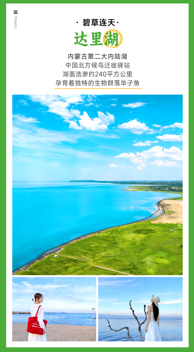 在这里拍照游玩,观赏达里湖的美景。登山曼陀山,高大的风车伴着太阳的光辉不停地旋转,阳光洒在草原湖泊上,水天一色,缤纷绚烂。乘坐摆渡车到达湖边的碧海银滩,近距离欣赏达里湖美景。午餐可品尝达里湖特产-华子鱼。