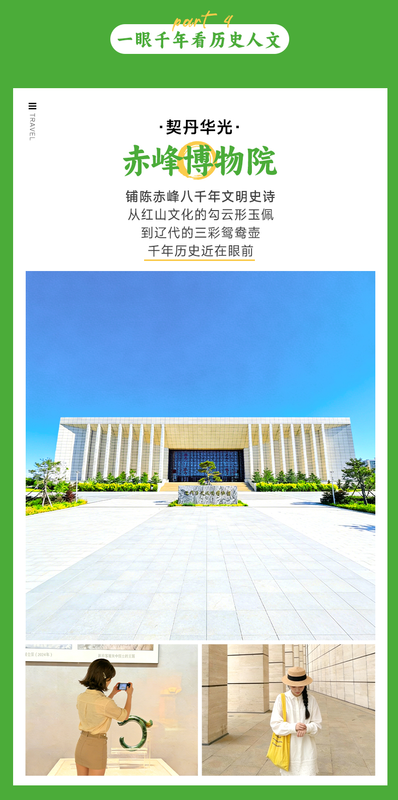 馆内设有 "日出红山"" 古韵青铜 ""契丹华韵"" 和同一家 "4 个基本陈列,分别展示了赤峰的史前文化、草原青铜文化、辽文化以及元明清时期北方各民族共同创造的文化,堪称" 北方民族历史的百科全书 "为这场贯穿草原、森林、沙湖、奇石的壮阔旅程,画上一个深厚的文化句点。
