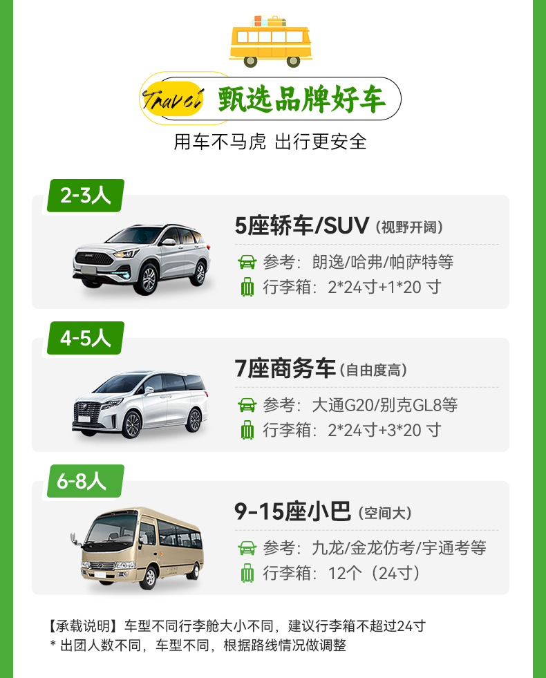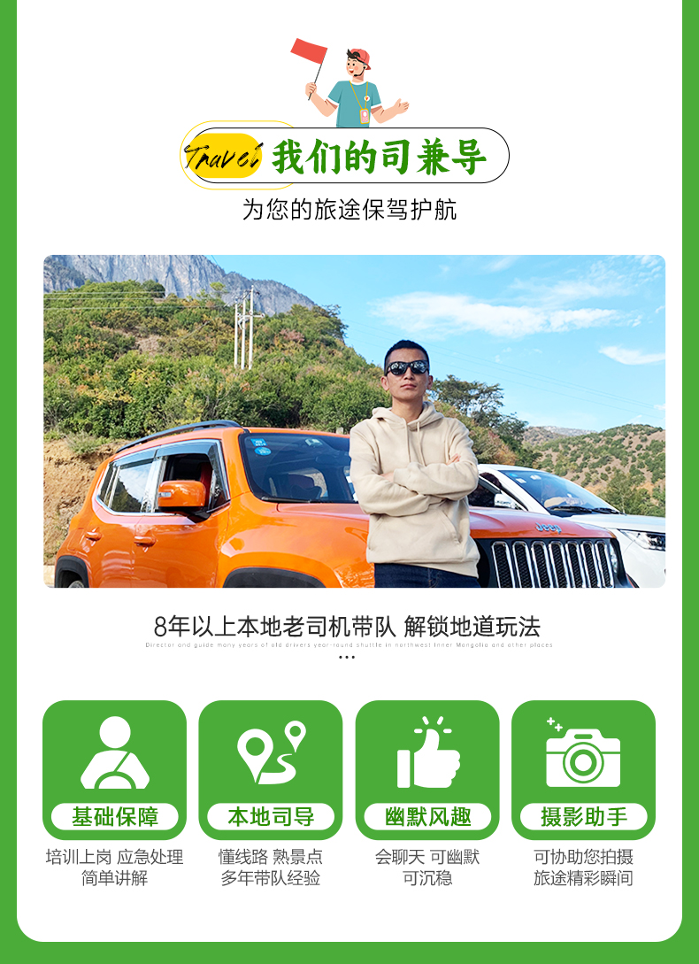 5、领队:司机兼领队(司机仅提供向导、代办住宿等服务;无法像专业领队一样提供讲解、景区伴游等服务!)